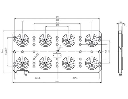 液壓零點定位系統(tǒng)適用于T型槽間隙為63、100和125mm的機床工作臺,通過M12的沉頭螺栓緊固。至少有兩個定位孔,以便準確定位。兩個零點定位器之間的間距是200mm。液壓快速接頭是預先安裝好的,氣壓除屑功能接口可選擇性的接通。